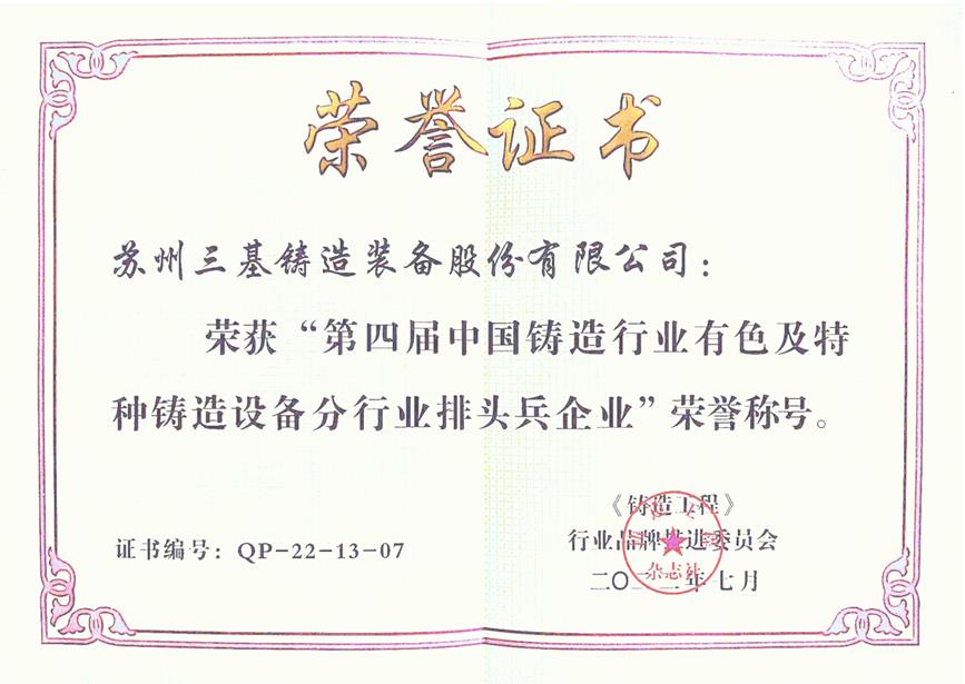 由《鑄造工程》雜志社舉辦的“第四屆中國鑄造行業(yè)綜合百強、分行業(yè)排頭兵企業(yè)”的評選活動中,公司榮獲“第四屆中國鑄造行業(yè)有色及特種鑄造設備分行業(yè)排頭兵企業(yè)”榮譽稱號。