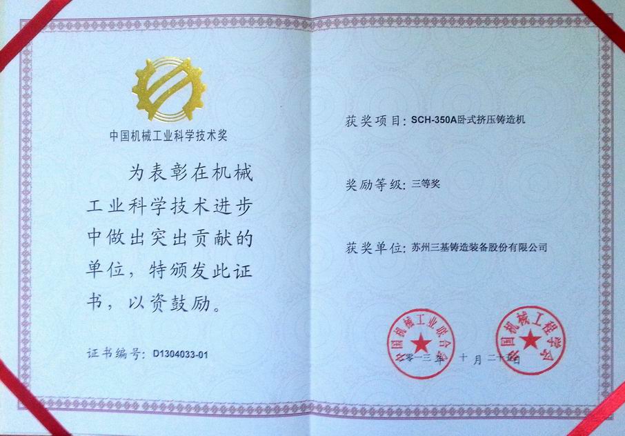 2008年,公司自主研發(fā)的SCH-350A臥式擠壓鑄造機(jī),在2011年獲得國(guó)家重點(diǎn)新產(chǎn)品的之后,再次獲得了2013年中國(guó)機(jī)械工業(yè)科技進(jìn)步獎(jiǎng)三等獎(jiǎng)殊榮。