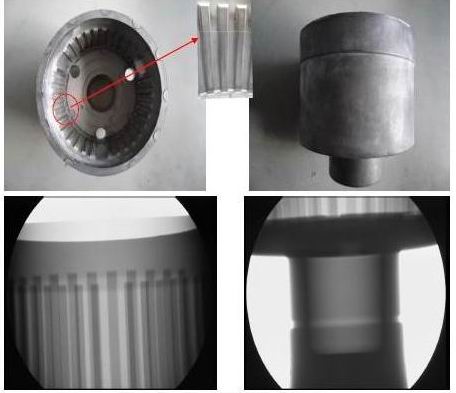 研發(fā)成果:成型后的擠鑄件外觀無缺陷,內(nèi)腔及花鍵均無拉傷,通過了客戶專用齒形檢具驗收。通過按ASTM-E-505標準采用x-ray檢測內(nèi)部質(zhì)量,鑄造缺陷小于1級。