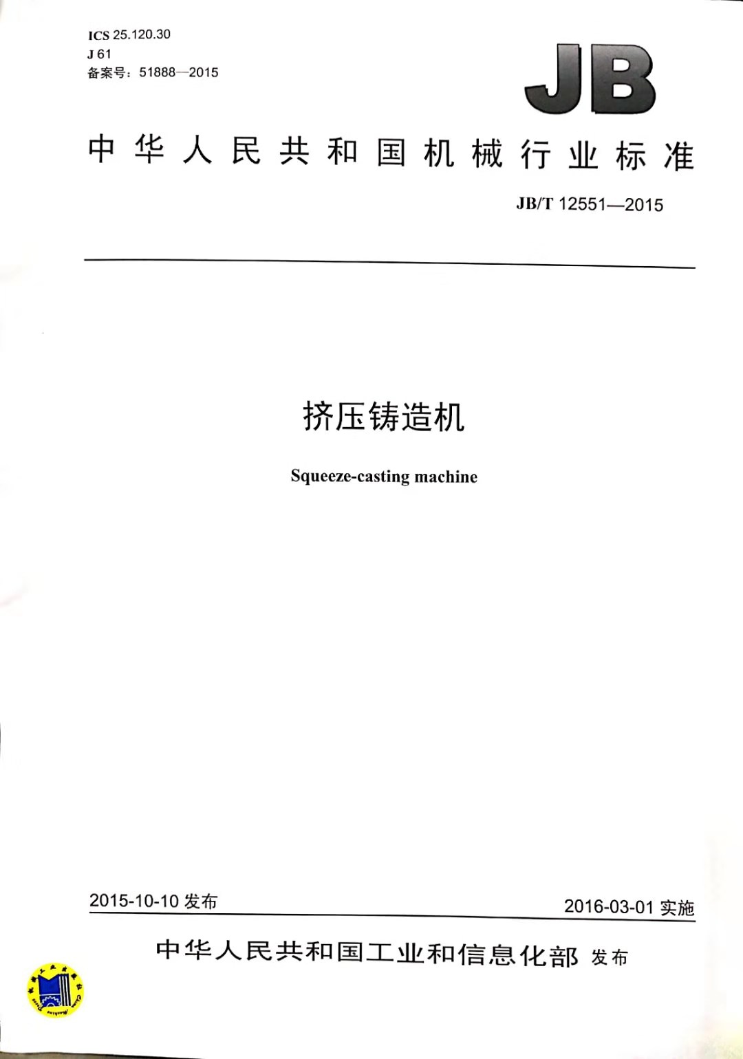 由蘇州三基鑄造裝備股份有限公司主持,哈爾濱吉星工程機械有限公司、中國兵器科學研究院寧波分院等單位參與制定的《擠壓鑄造機》行業(yè)標準于2015年10月10日發(fā)布,并于2016年3月1日起正式實施。該標準為國內(nèi)在擠壓鑄造領(lǐng)域制定的首個標準。